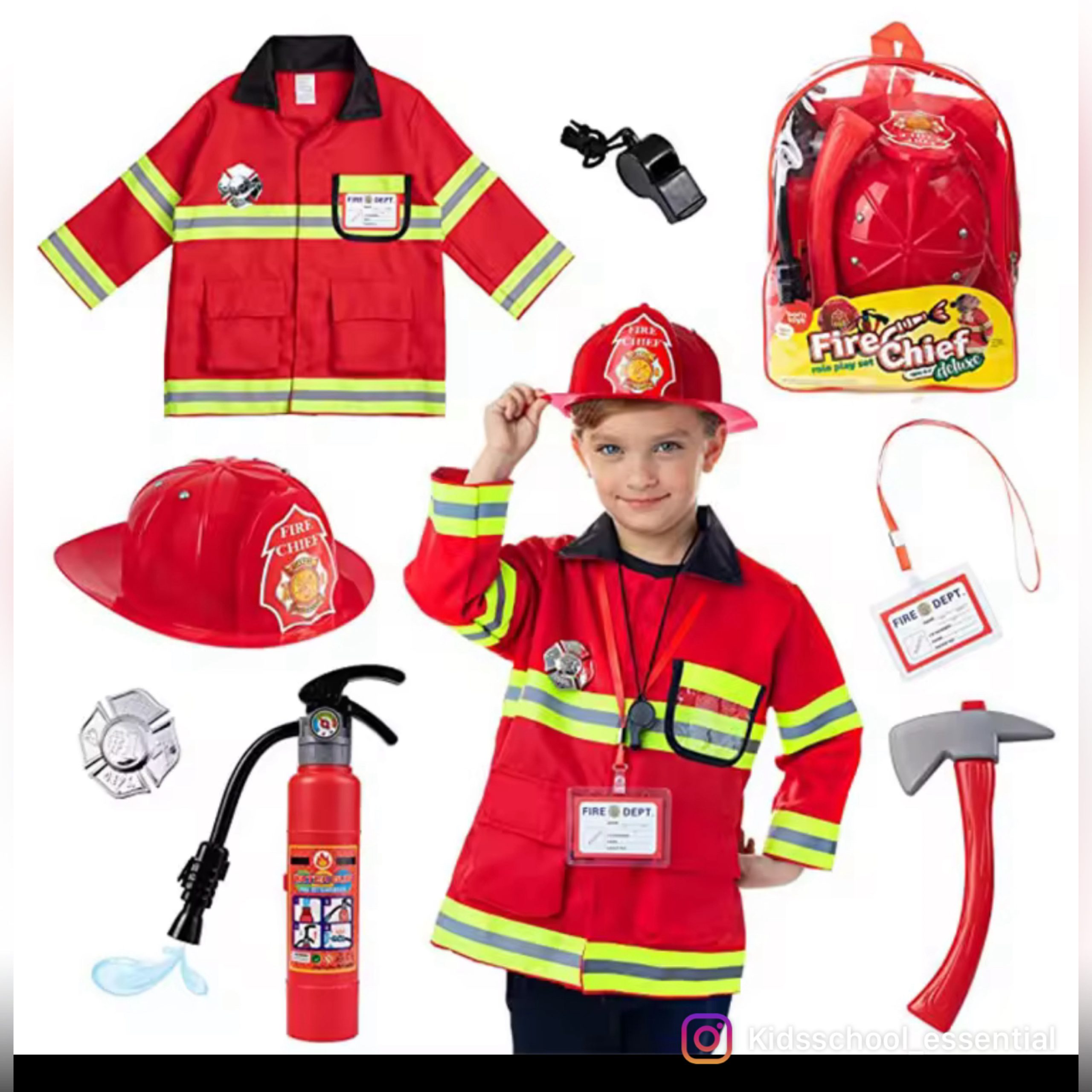 Includes a bright red jacket with reflective strips, matching pants, and a firefighter helmet for an authentic look.
